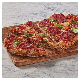 Vorgebackene Steinofenpinsa mit aromatischer Tomatensoße aus italienischen Tomaten, edler Fenchel-Salami, Rucola-Pesto und Provolone-Käse aus Italien. 29 x 18 cm